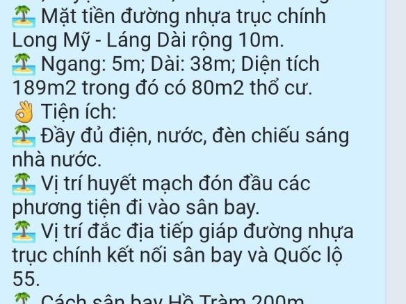 🏝️ Ngang: 5m; Dài: 38m; Diện tích 189m2 trong đó có 80m2 thổ cư.