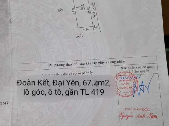Đoàn Kết, Đại Yên, 67.4m2, lô góc, ô tô vào, gần TL 419