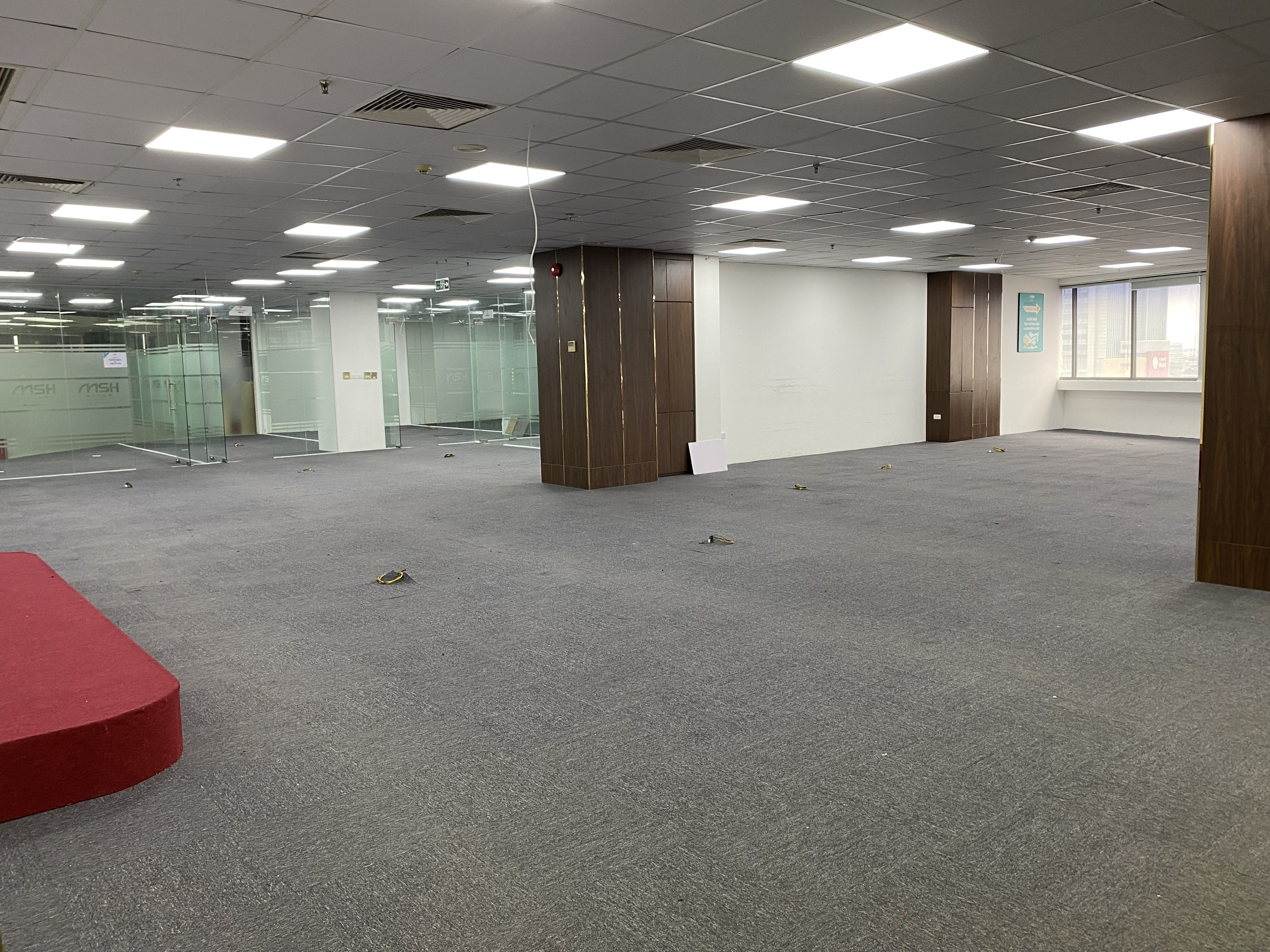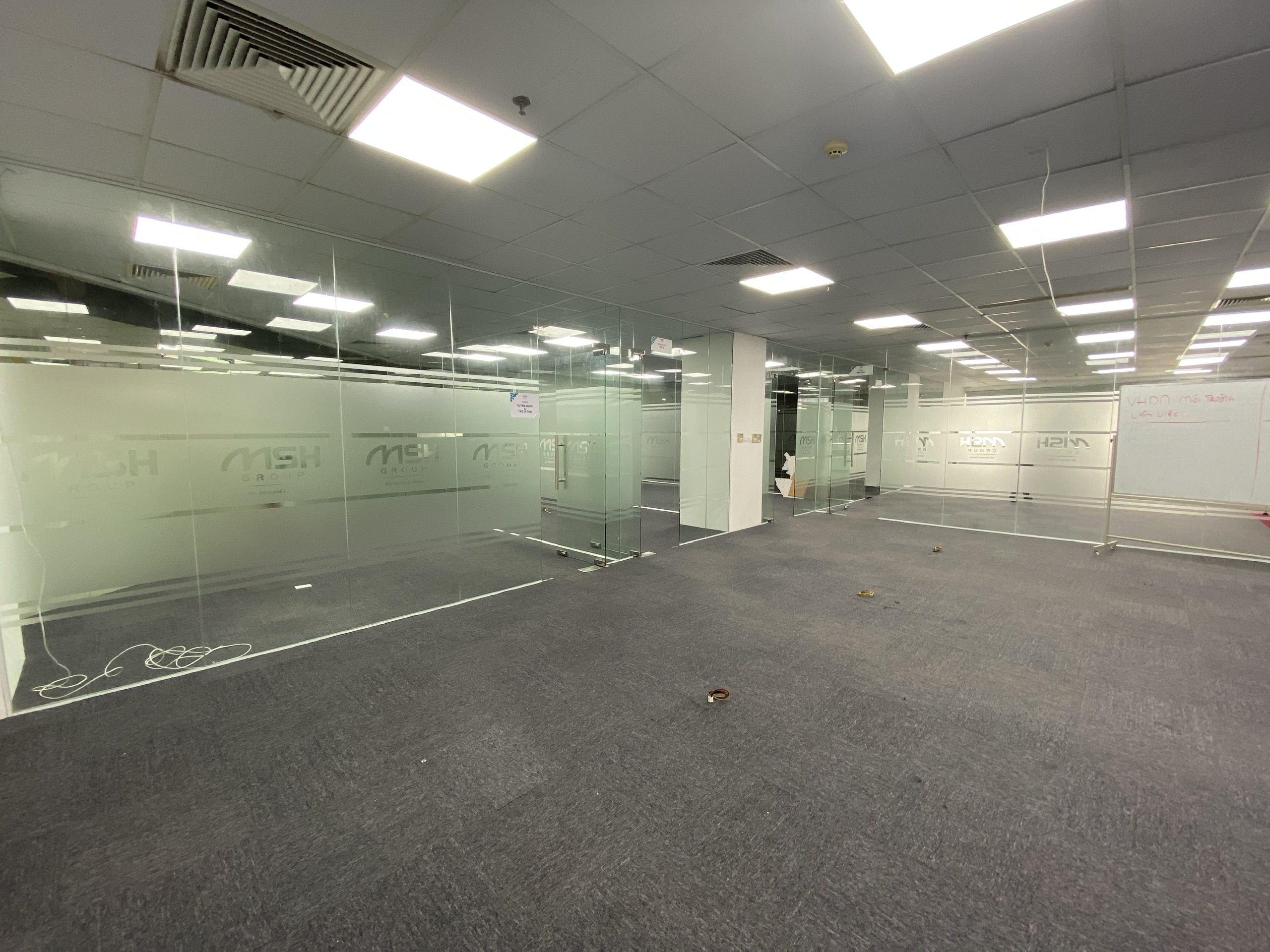 Văn phòng đã thiết kế sẵn, bàn giao gồm trần thả, đèn điện, điều hòa, sàn trải thảm, rèm, đầu chờ internet…