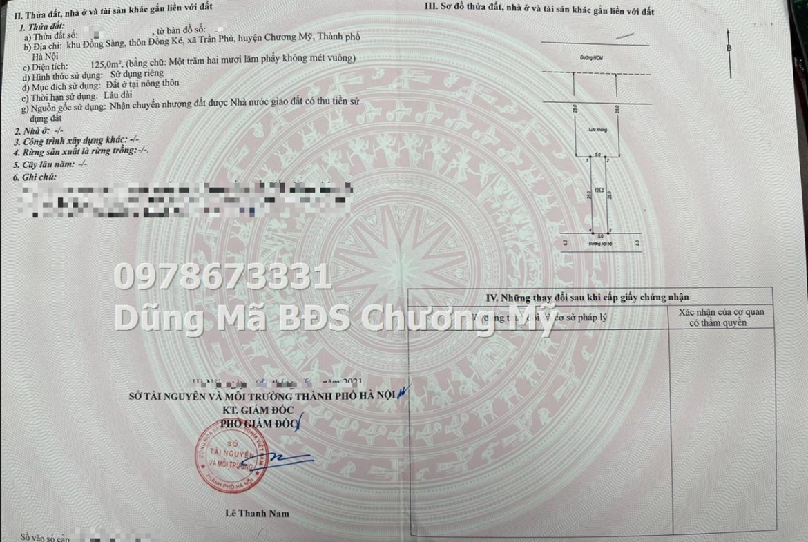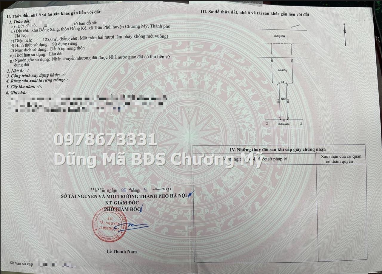 – Diện tích : 125m2 , full thổ cư – Mặt tiền 5m = hậu vuông vắn – ĐƯờng trước đất rộng 6m ô tô tránh nhau – Vị trí: Trần Phú, Chương Mỹ, Hà Nội – Đường rộng ô tô vào tận nhà