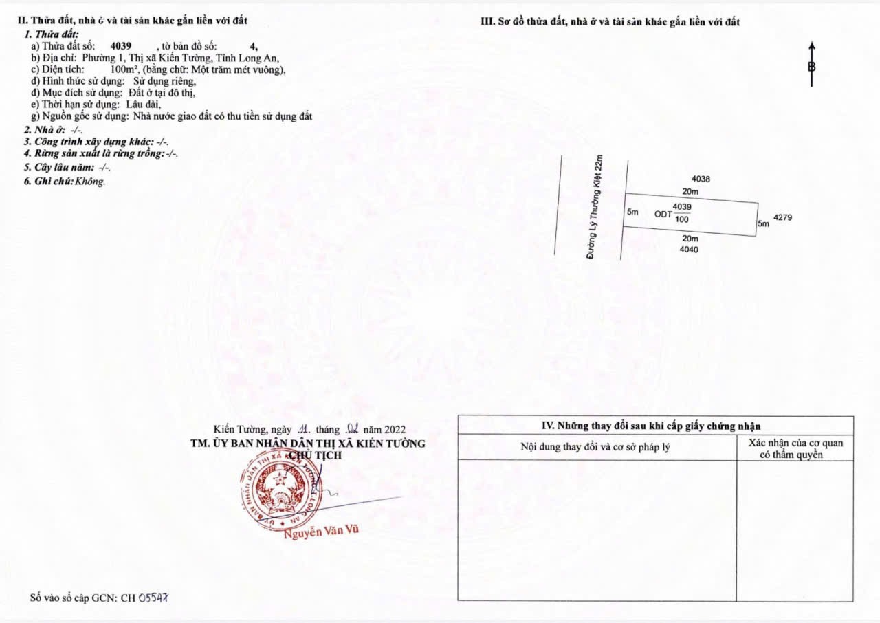 – Vị trí đắc địa: Mặt tiền đường Lý Thường Kiệt, Phường 1, Thị xã Kiến Tường, Long An. Mặt tiền nhựa 22m, giao thông thuận tiện