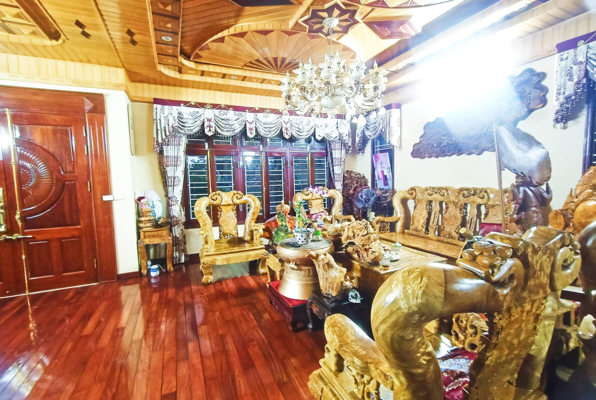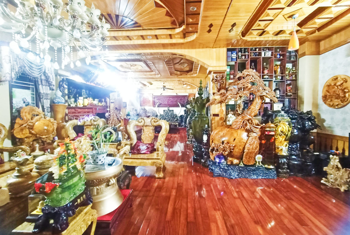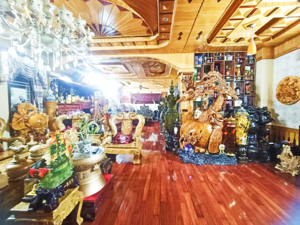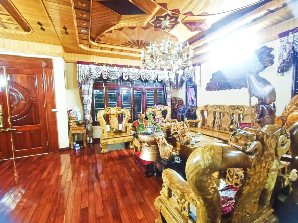 Là gian thờ, khu sinh hoạt chung và không gian phòng khách bày trí nội thất khủng, 100% là các loại gỗ quí từ sàn ốp tới trần.