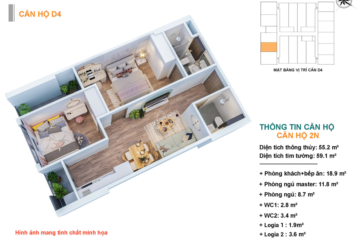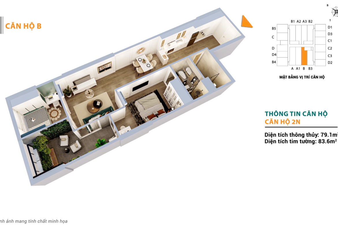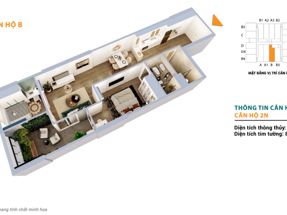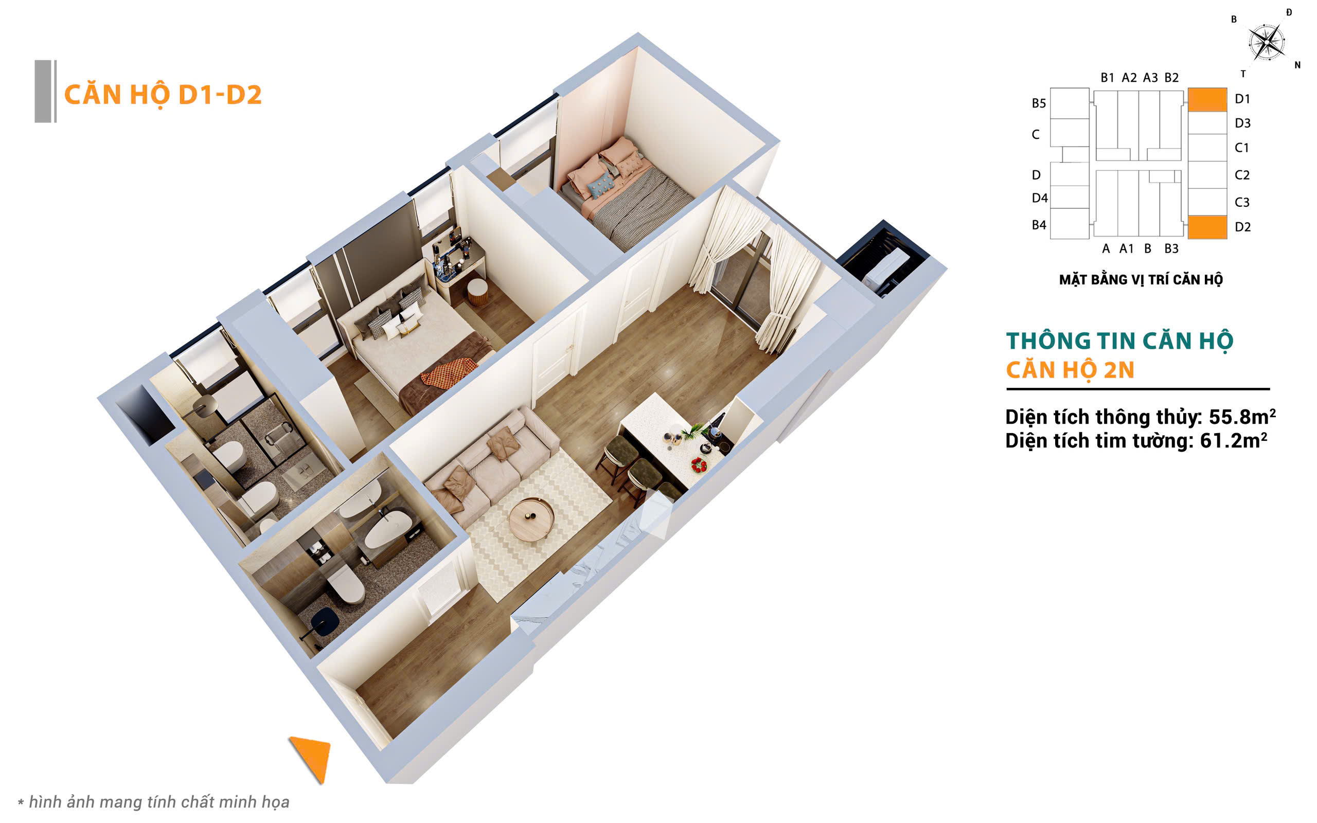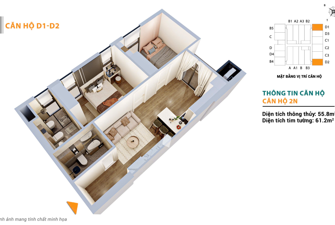 * Căn 2 ngủ – 55.8m² (TB – DN):