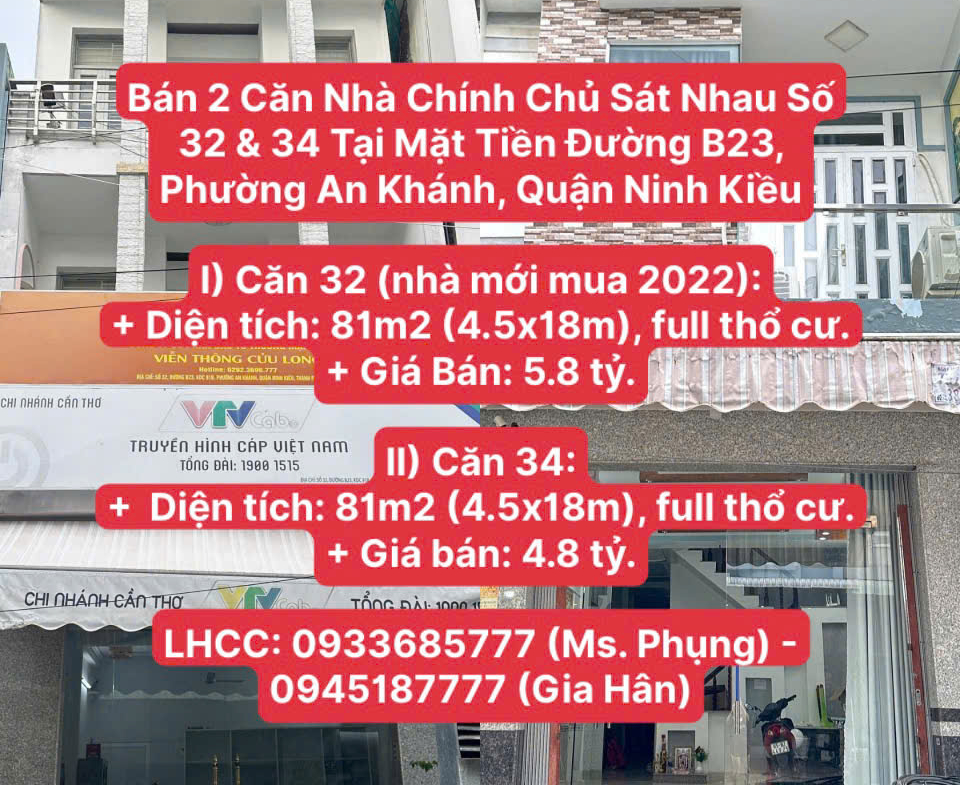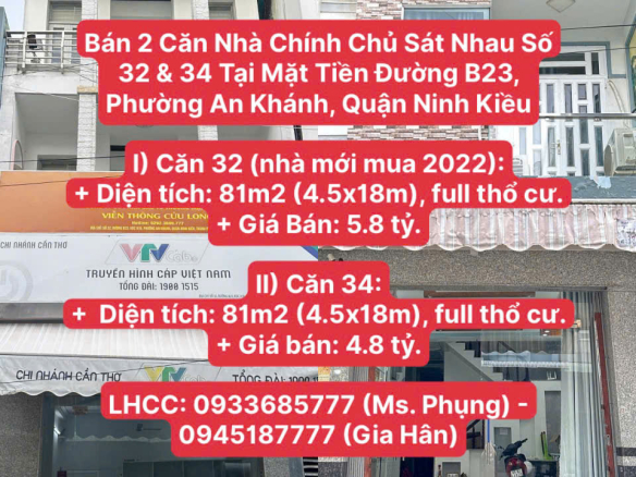 Bán 2 Căn Nhà Chính Chủ Sát Nhau Số 32 & 34 Tại Mặt Tiền Đường B23, Phường An Khánh, Quận Ninh Kiều