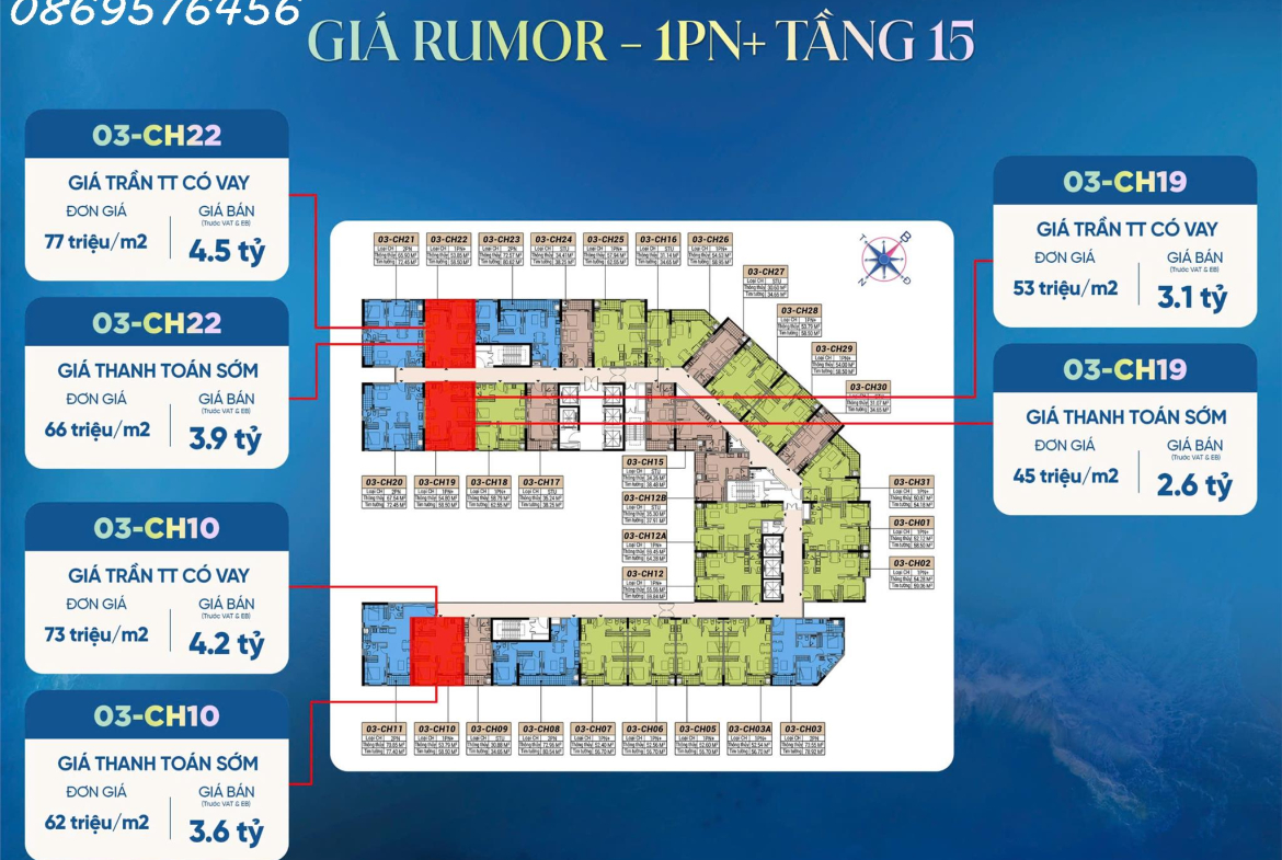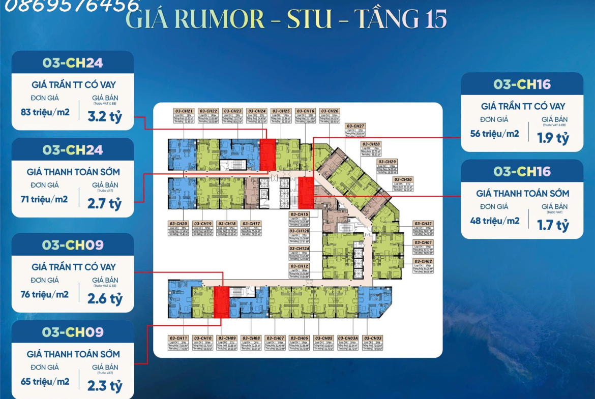 Căn Studio: có DT từ 30 mét, Đơn giá: từ 48 đến 56 triệu/mét.