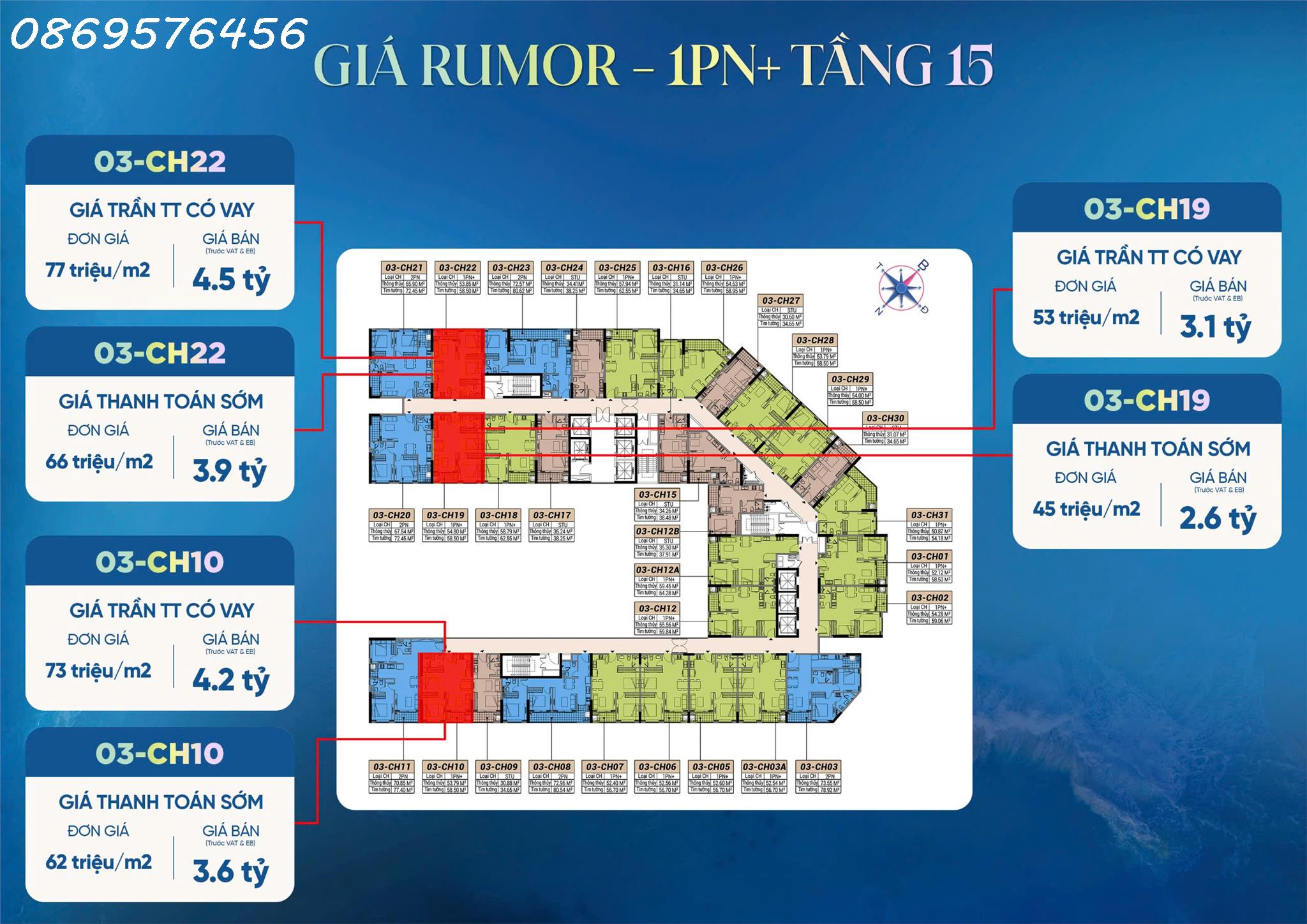 Căn 1 PN+: có DT từ 58 mét, Đơn giá: từ 45 đến 53 triệu/mét.