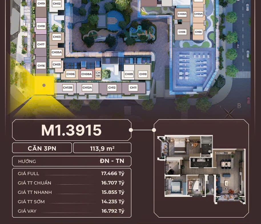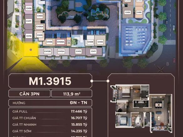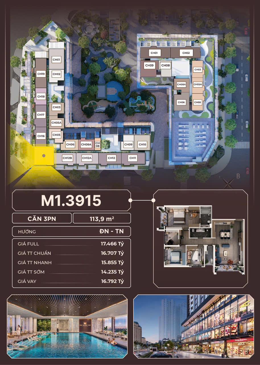 – M1.3912: 3 Phòng ngủ ( DT thông thủy: 120,3m2) : Giá 13,5 tỷ