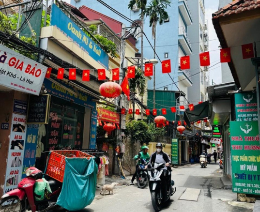 + Ngõ thẳng tắp, thông thiên các ngả, ô tô chở hàng 5 tạ chạy vòng quanh. Đường ô tô tránh cách vài nhà.