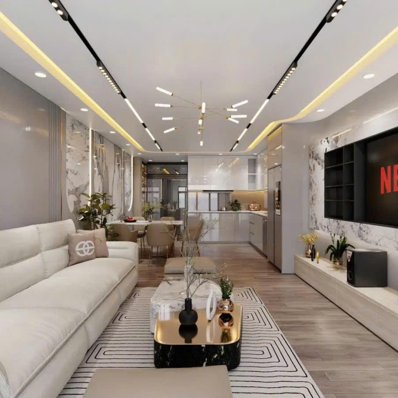 + Tầng 2 : phòng khách + bếp, ban công.