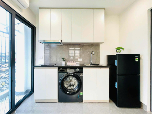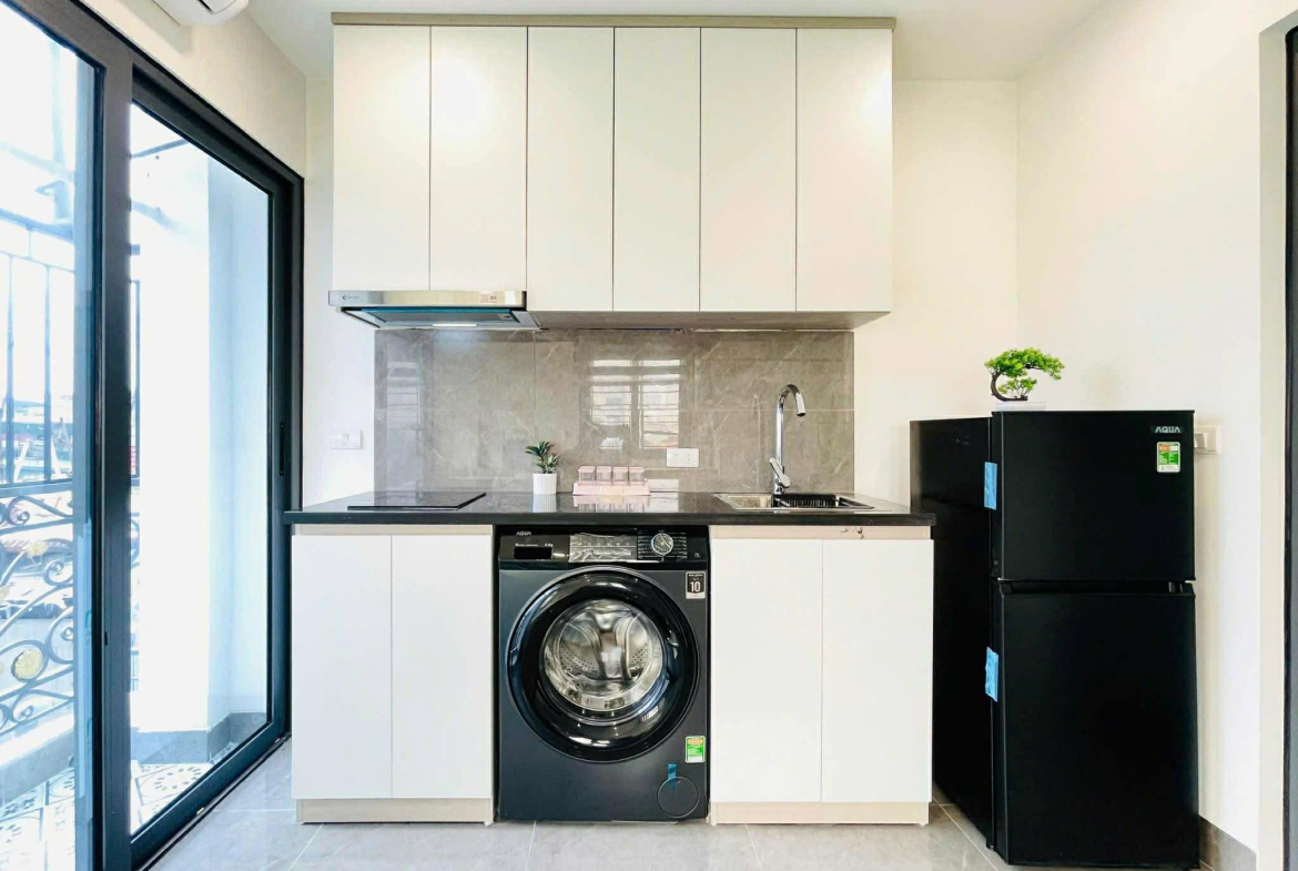 * Nội thất đầy đủ, mới cứng: Điều hòa nóng lạnh, giường tủ, đệm, kệ bếp – tủ bếp, hút mùi, bếp từ, tủ lạnh, máy giặt riêng, thang máy.