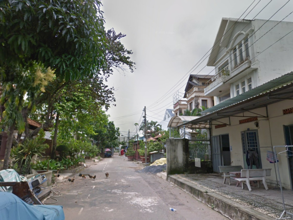 -Đường trải nhựa trước nhà, ô tô tránh nhau.