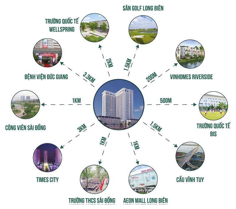 Trường học: Dự án gần nhiều trường học mầm non, tiểu học, cấp 2 và cấp 3 như mầm non Phúc Đồng, mầm non CLC Sài Đồng, tiểu học Sài Đồng, Vinschool.