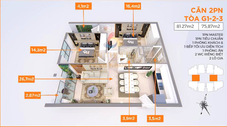Căn 76m2 tòa G2 tầng 8 hướng TB giá 3,7 tỷ