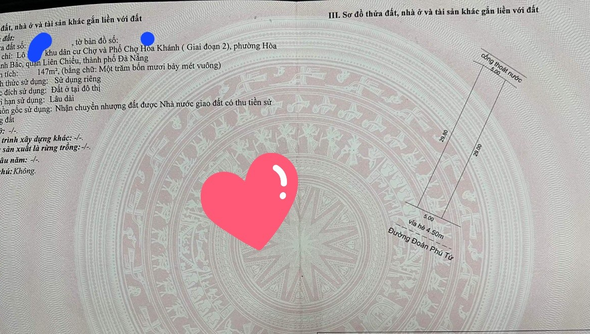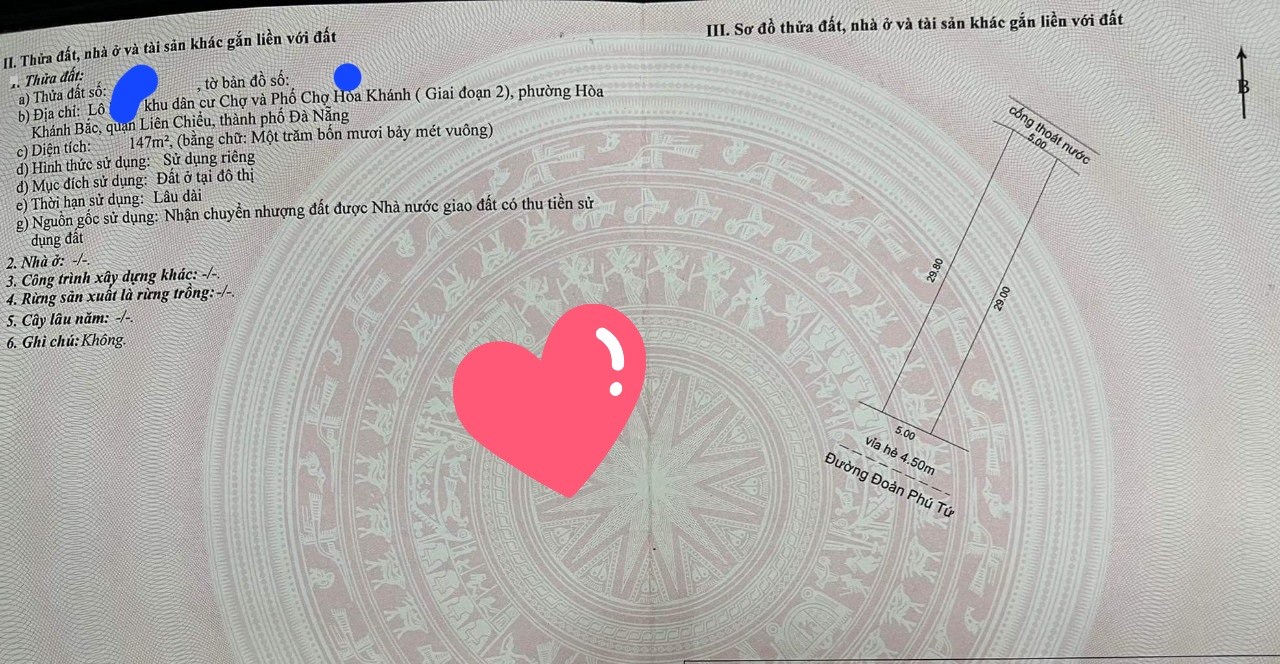 – Ngang: 5 m, dài 29 m . vuông vắn
