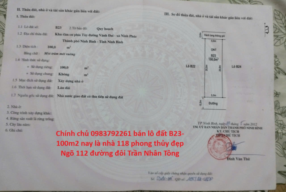 Chính chủ sđt 0983792261 Cần bán lô đất B23 diện tích (5×20=100m2). Hướng Nam Nay là nhà số 118 Số nhà phong thủy đẹp nhất khu vực nhất phát Hưng Thịnh cát tường … Giá khởi điểm 4ty ××× còn thương lượng sâu.. … Muốn có ngôi nhà phong thủy tốt cho vài đời con cháu An khang thịnh vượng hãy xuống tiền mua nhà để ở số nhà phong thủy đẹp nhất. Ngõ 112 đường đôi Trần Nhân Tông sát cạnh khách sạn Yến Ngọc và Thiên Hà đối diện Gobichsi Ninh Bình và công ty HonDa và moto mi subisi và các công ty tập đoàn lớn công nghệ xanh thông minh đang hoạt động. Một lô B23 Duy nhất mở bán nằm kề các tiện ích khác chỉ vài phút.