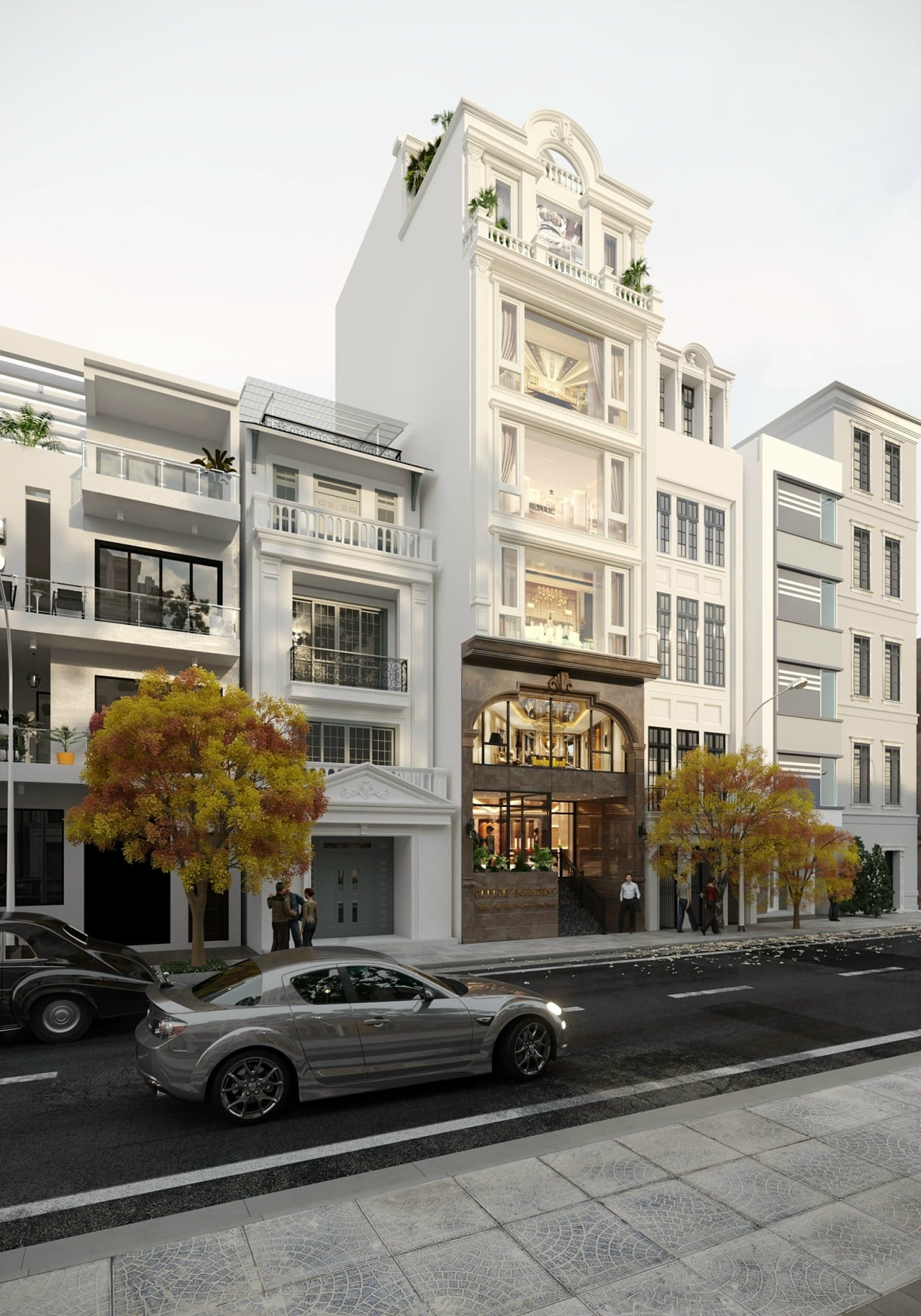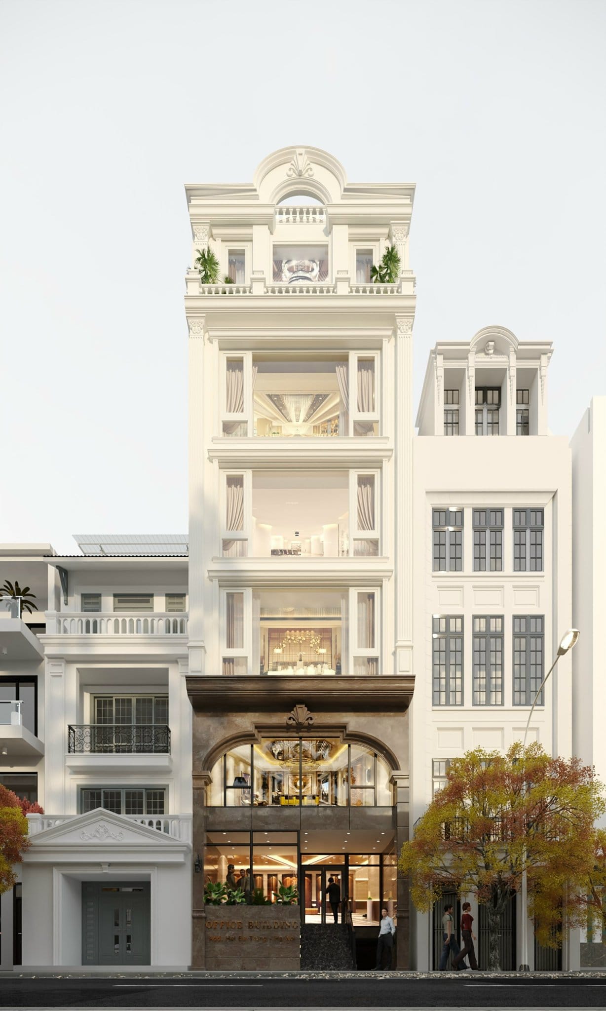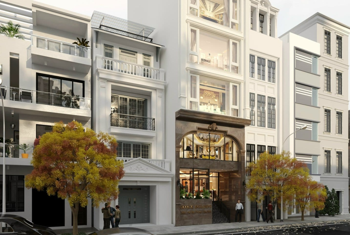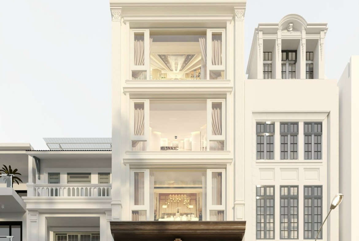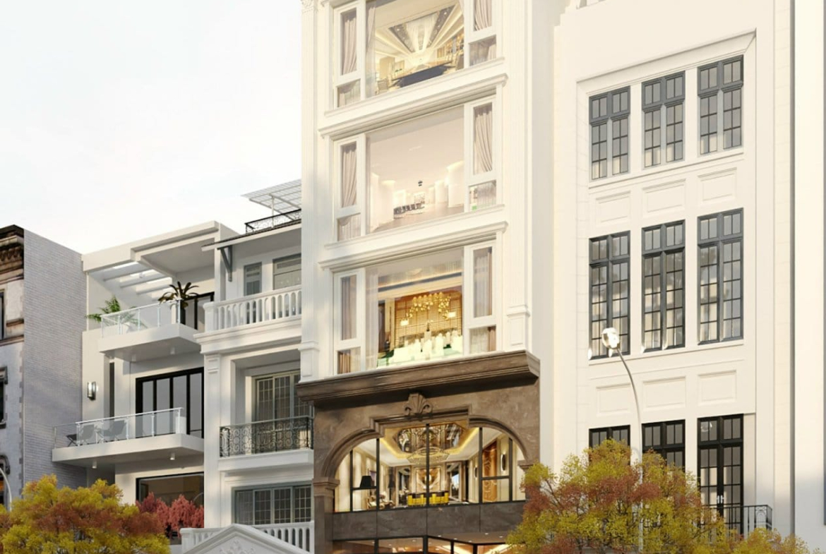 Thiết kế gồm: 1 hầm để xe, 1 lửng, 5 tầng nổi, 1 tum.